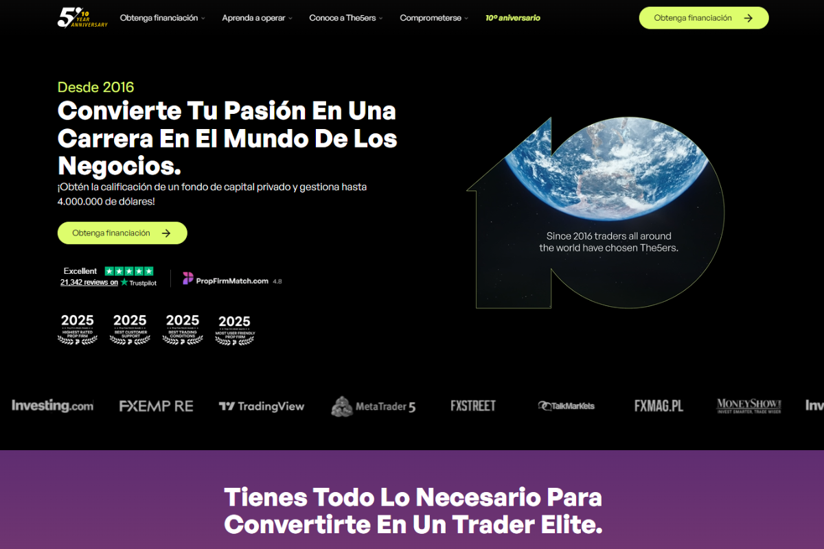 The5ers es una empresa de fondeo con varios programas diseñados para traders de diferentes niveles. Ofrece distintos modelos de financiación y un enfoque orientado al crecimiento progresivo del capital, permitiendo a los traders escalar sus cuentas a medida que alcanzan objetivos de rendimiento y consistencia en su operativa.