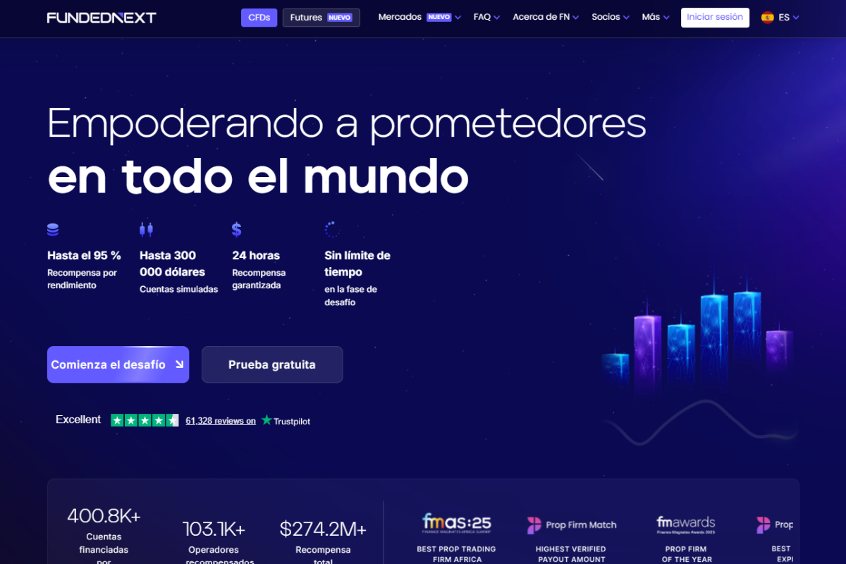 FundedNext es una prop firm internacional que ofrece múltiples modelos de cuentas fondeadas y evaluaciones para traders. La plataforma permite operar diferentes mercados como forex, índices, materias primas y criptomonedas, ofreciendo diversas plataformas de trading y opciones de escalado de capital para traders consistentes.